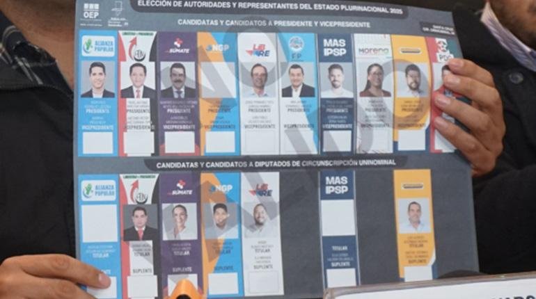 La papeleta de sufragio aprobada por el TSE tiene dos franjas: una superior con el emblema de la organización política, la fotografía y el nombre de su candidata o candidato a la presidencia, y el nombre de su candidata o candidato a la vicepresidencia.