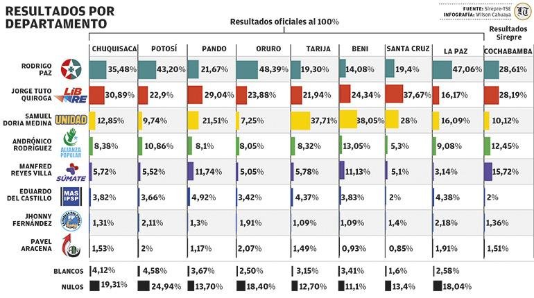 El Tribunal Electoral Departamental de La Paz cerró anoche al 100% el cómputo oficial. El Partido Demócrata Cristiano (PDC), de Rodrigo Paz y Edman Lara, ganó en ese departamento la elección con 697.751 votos (47,05%). LOS TIEMPOS