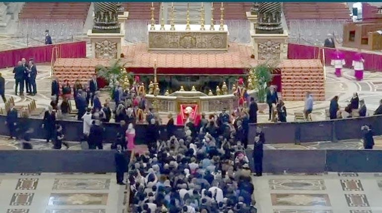 Una vez en la basílica vaticana, el ataúd del Papa fue depositado frente al altar de la Confesión sobre una pequeña plataforma ligeramente inclinada, colocada sobre una alfombra en el suelo, y no sobre el catafalco como siempre ha ocurrido en el pasado, respetando los deseos de Francisco.