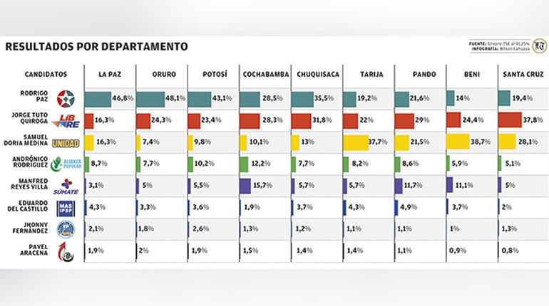 Mientras que Samuel Doria Medina, de Unidad, se impuso en Beni con 38,7 % de los votos. Rodrigo Paz quedó tercero en Santa Cruz con 19,4% y Beni con 14, y segundo en Pando con 21.8 %. Doria Medina, por su parte, se ubicó segundo en Santa Cruz con 28,1% y tercero en Pando con 21,5%.
