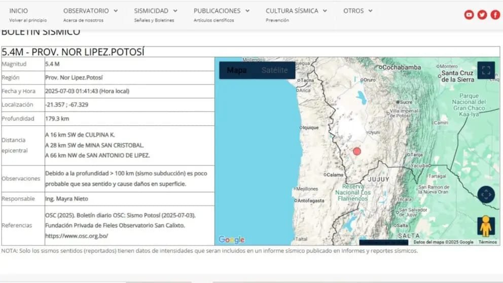 Un sismo de magnitud 5.4 sacudió este jueves a las 01:41 a la región Nor Lípez del departamento de Potosí. De acuerdo a la Red Sismológica del Observatorio San Calixto se trataría de un “sismo intermedio”.