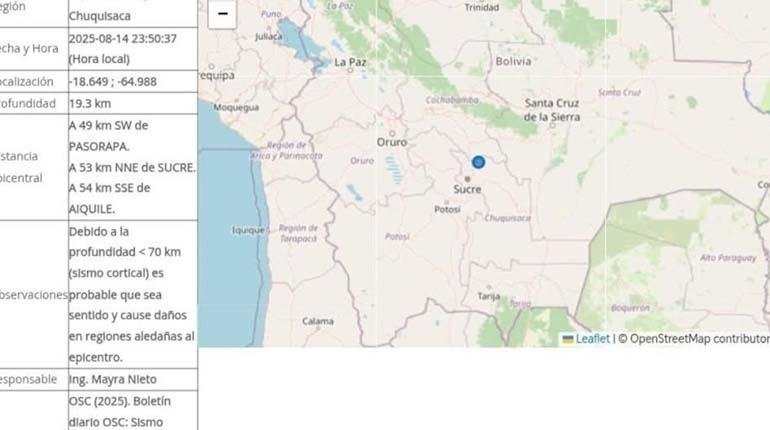 El Observatorio San Calixto emitió un boletín sísmico donde reporta un sismo de magnitud 4,0 M, ocurrido el 14 de agosto de 2025 a las 23:50:37, con epicentro en la provincia de Zudañez, departamento de Chuquisaca.